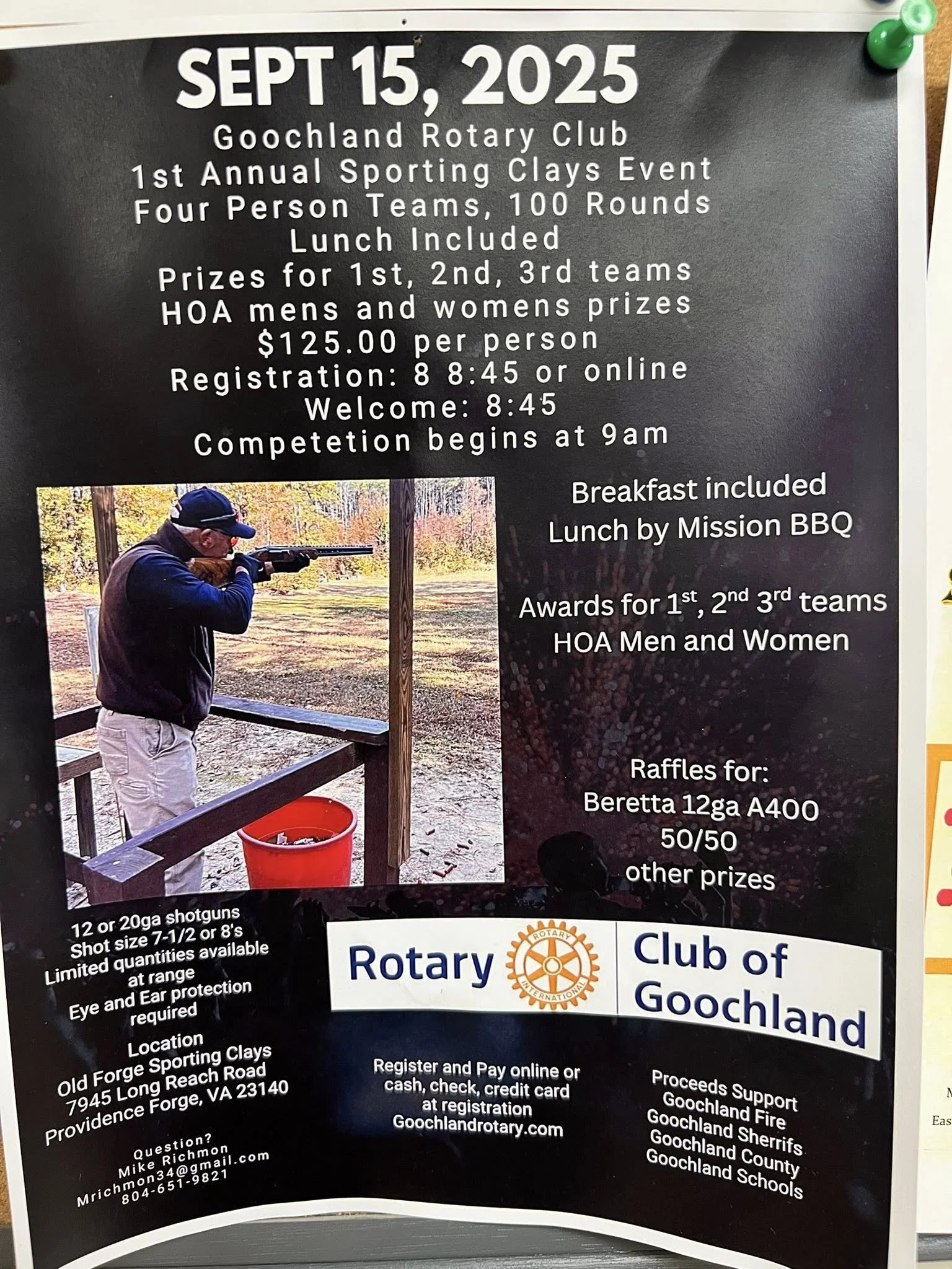 1st Annual Sporting Clays Event Monday, September 15, 2025 8:00 AM 5:00 PM Old Forge Sporting Clays 7945 Long Reach Road Providence Forge, VA, 23140 United States (map) Google Calendar ICS