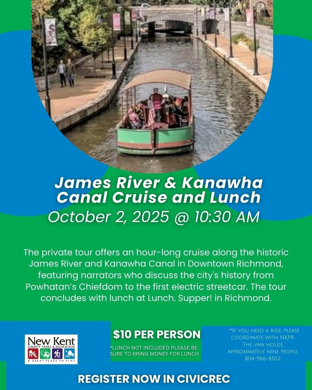 Back to All Events James River & Kanawha Canal Cruise and Lunch Thursday, October 2, 2025 10:30 AM 1:30 PM Google Calendar ICS “Join us for a daytime adventure in Richmond! Enjoy a private canal tour followed by lunch. Reserve your spot today in CivicRec, and give NKPR a call if you have any questions (804) 966-8502.” - New Kent Parks & Recreation Facebook Page