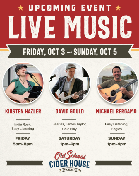 โ€œJoin us for an incredible weekend of live music at Old School Cider House in New Kent, VA! Come out on Friday, October 3rd, Saturday, October 4th, and Sunday, October 5th for amazing performances and crisp ciders! ๐ŸŽ๐ŸŽถ