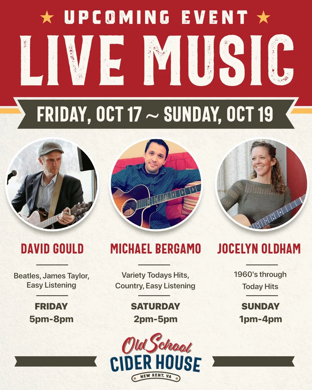 “Join us for an incredible weekend of live music at Old School Cider House in New Kent, VA! Come out on Friday, October 17th, Saturday, October 18th, and Sunday, October 19th for amazing performances and crisp ciders!