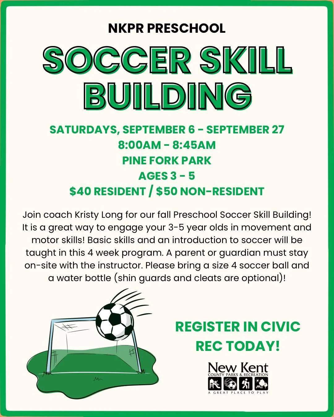 New Kent Parks & Recreation: Preschool Soccer Skill Building Saturday, September 27, 2025 8:00 AM 9:00 AM Pine Fork Park 6410 Pine Fork Road Quinton, VA, 23141 United States (map) Google Calendar ICS “Check out our Pre-K Soccer Skill Building! Register in Civic Rec today and let us know if you have any questions!” - New Kent Parks & Recreation Social Media