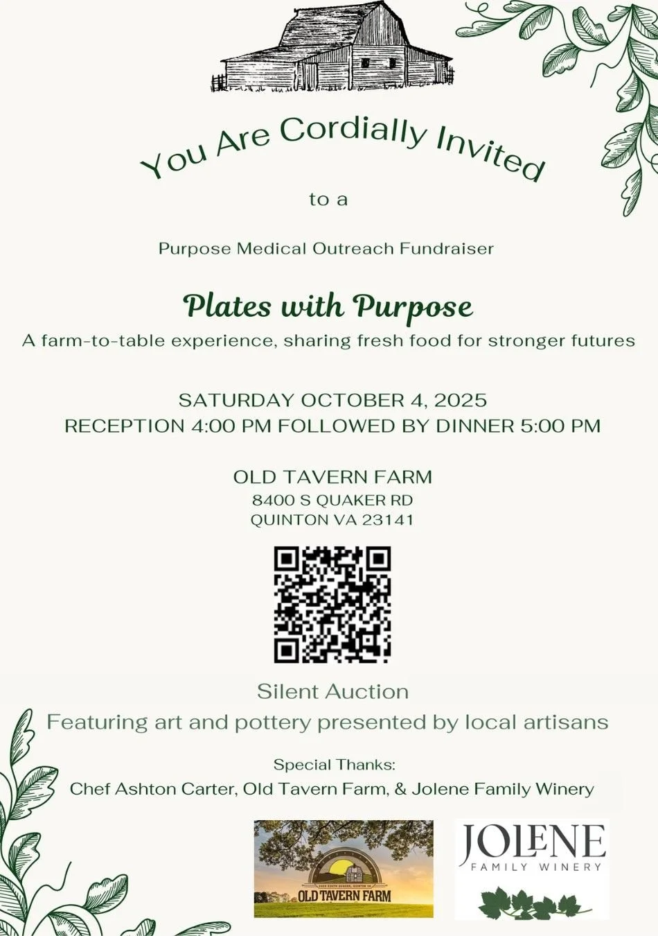 This special farm-to-table experience at Old Tavern Farm will feature dinner by Chef Ashton Carter, local artisan auction, and an evening of giving back in support of Purpose Medical Outreach. We’re honored to be part of this event alongside amazing local talent and partners.