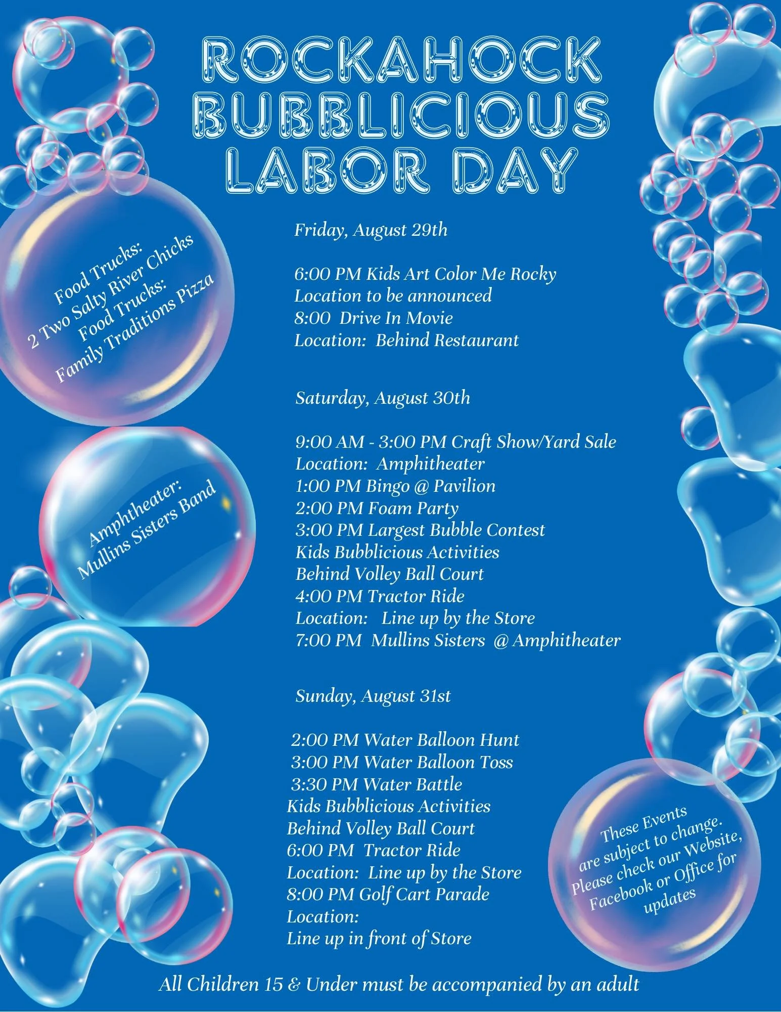 Rockahock Bubblicious Labor Day Friday, August 29, 2025 6:00 PM Sunday, August 31, 2025 11:59 PM Rockahock Campground 1428 Outpost Road Lanexa, VA, 23089 United States (map) Google Calendar ICS